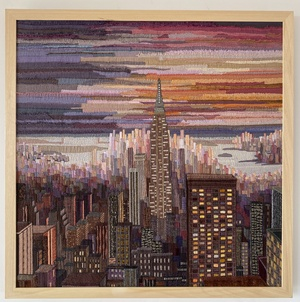 Cette vue de Manhattan a été réalisée entièrement en textile: velours, dentelles, tissus précieux ou teints. Chaque building a été travaillé séparément puis appliqué sur le fond. cette oeuvre magistrale a demandé des centaines d'heures de travail.
